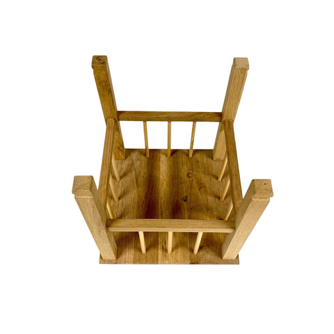 De tafel is volledig met de hand gemaakt van massief oud eikenhout, afkomstig van hergebruikte meubelen. Alle verbindingen zijn zorgvuldig gedeuveld en verlijmd met watervaste witte houtlijm, zonder gebruik van spijkers of schroeven.